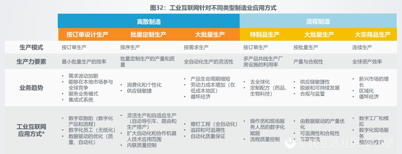 生产制造的方式主要分为离散制造与流程制造,其中离散制造的生产模式主要有按订单生产、排序生产、按需求生产,流程制造的生产模式有按订单生产、按批量生产与连续生产。生产模式、生产力要素与业务趋势的差异性,导致不同制造业企业在选择工业互联网应用方案时具备侧重性和差异性,企业在实施工业互联网时需要选择合适的方案。