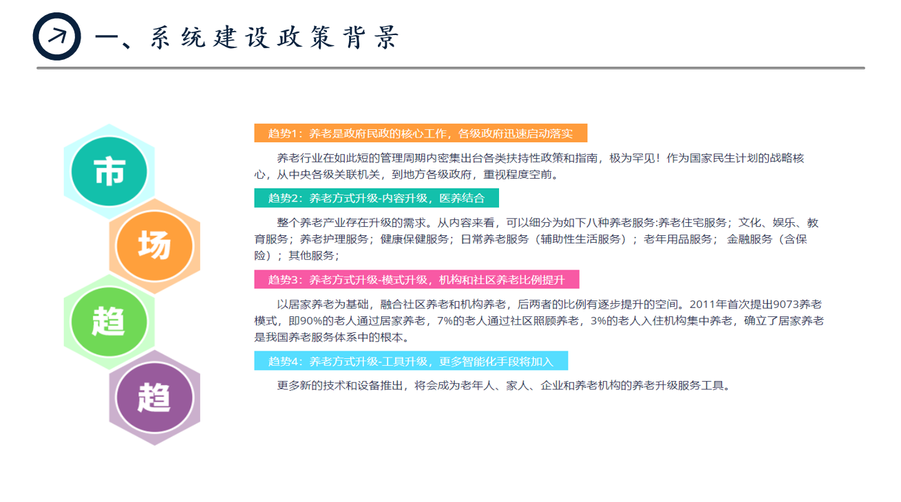 “智慧养老”是指利用互联网、移动互联网、物联网、云计算等技术手段,搭建“智慧养老云服务管理系统”,通过系统有效整合社会资源、政府资源、信息资源,借助系统及各类终端按照养老服务规范和服务标准向老人及家属等提供涉及安全看护、健康管理、生活照料、休闲娱乐、亲情关爱等五个方面的服务,达到“多位一体,齐心和谐”的服务效果,通过移动终端让老人实现会联网、会搜索、会下载、会安装、会使用“五个会”,实现“老人网上自由行”,让老人、家属获得“触手可及”的服务保障。
