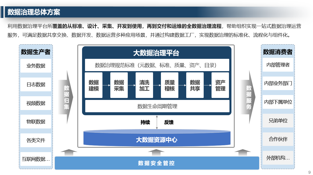 数据治理专注于将数据作为企事业单位数据资产进行应用和管理的一套管理机制,能够消除数据的不一致性,建立规范的数据应用标准,提高数据质量,实现数据内外部共享,并能够将数据作为组织的宝贵资产应用于业务、管理、战略决策中,发挥数据资产价值。